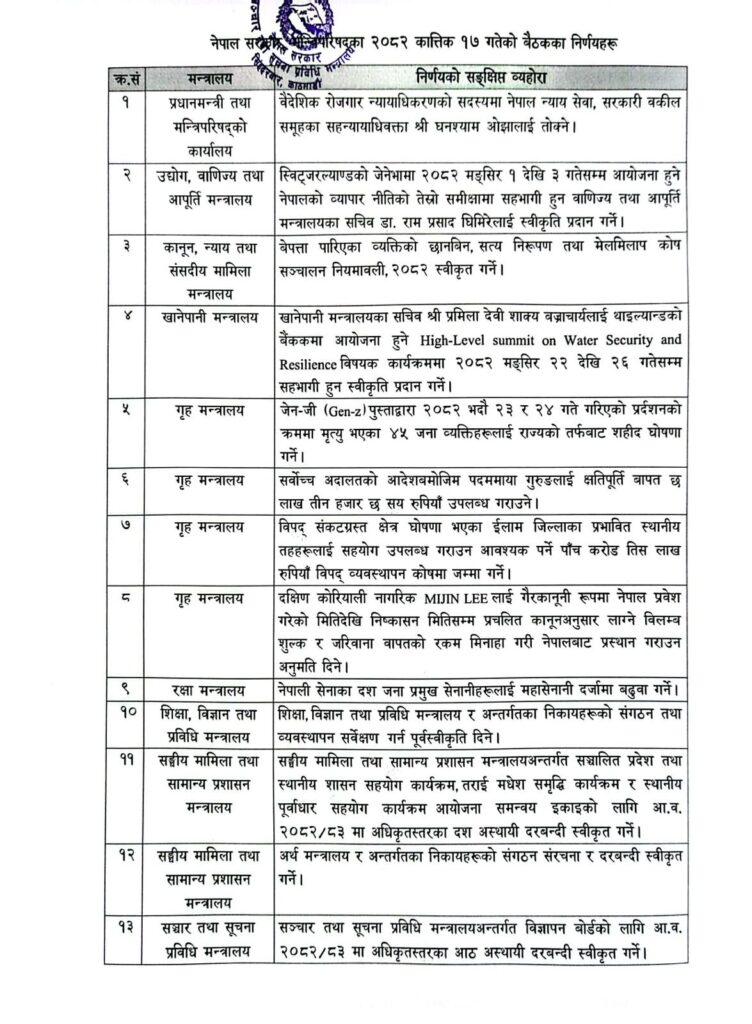 मन्त्रिपरिषद् बैठकका १३ निर्णय (सूचीसहित)